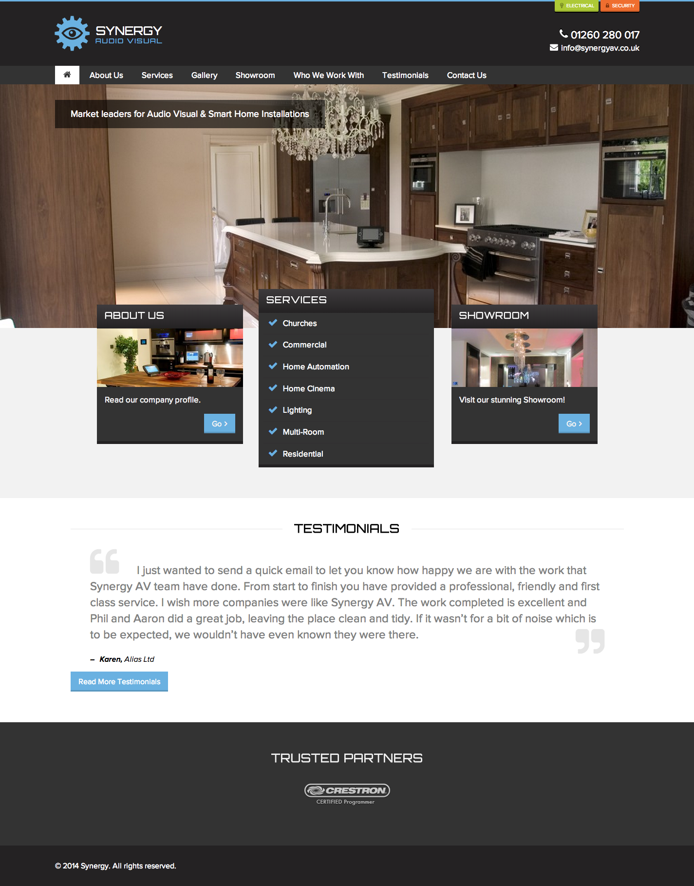 Synergy AV required a responsive website split into 3 separate divisions to reflect their Audio Visual, Electrical and Security departments, with a logo and branding to enhance this. The three divisions work independently, yet all come together to provide a strong brand identity.